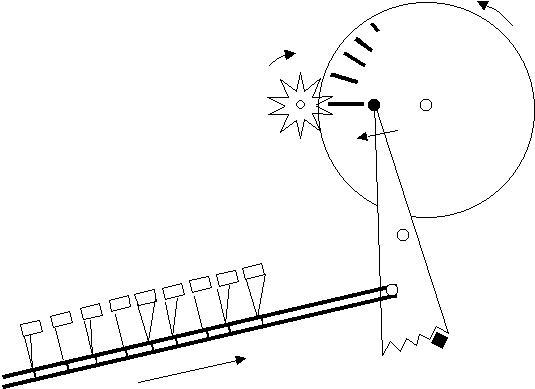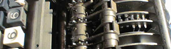 Die Kurbel der Maschine treibt eine Achse an, auf der eine Reihe kreisrunder Scheiben befestigt ist. Jeweils zwei Scheiben bedienen ein Zahnrad. Die Scheiben tragen kleine Zähne, die normalerweise nicht ins Zahnrad eingreifen, weil sie von Federn vom Zahnrad aus gesehen nach der Seite weggeschoben werden.